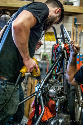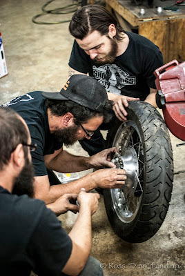 Dino had to take off and get back to school (he's studying Industrial Design, I'm soo proud of him - haha) , so we got a few less pics on the 3rd day. But the boys and I put in a TON of hours into this thing. It left the HHB shop needing nothing more than a new seatpan and foam, and some minor wiring to be on the road. We cleaned the carbs, installed the Pamco and fired up the engine on the first kick. Eddie put in some major hours and made sure a killer set of pipes got built along with help from Bryan.